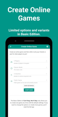 • Flexible Game Modes: Whether you’re in the mood for a quick game or a marathon session, “Can’t Stop, Won't Stop” offers something for everyone. Play against friends, strangers, or the AI at your convenience.